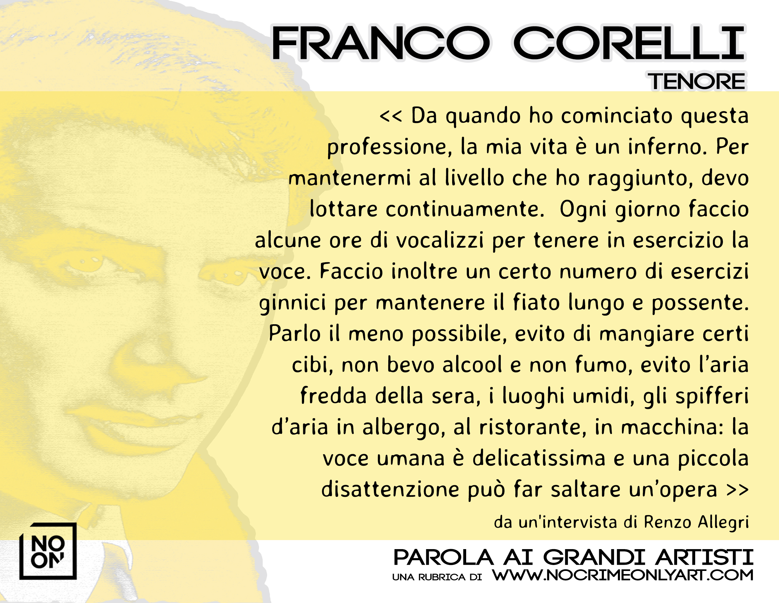 Le parole di Franco Corelli da un intervista di Renzo Allegri, fanno emergere l’immensa dedizione che l’artista riponeva nell’arte del canto. Una card da scaricare a questo link, da stampare e diffondere, come vademecum per le nuove generazioni di cantanti.