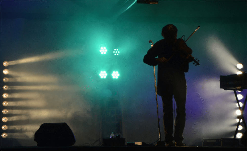 Al di là della suggestione di questi scatti notturni, mi piace sottolineare come l’autore sia riuscito a cogliere visivamente proprio quei particolari che ci fanno rivivere la festa, nel suo svolgersi fino alla sua conclusione, riassunta nell’immagine malinconica della ballerina che danza, sola, sotto la pioggia che comincia a cadere. Tuttavia, il racconto si compone di diverse unità, a partire dalla ripresa di spalle del principale protagonista dello spettacolo: il violinista Anchise Bolchi con l’inseparabile violino, anzi ‘the fiddle’, il vero mattatore del country insieme alla chitarra acustica. L’aspetto interessante di questa prima fotografia è proprio il punto di vista, che non è quello dello spettatore che assiste, ma quello del musicista dal palco. La platea scompare, assorbita dall’alone dei riflettori che riverberano nel fumo che si avvolge in nuvole trasparenti e assume colorazioni quasi da acquario. L’assenza degli spettatori rende visivamente plastica la figura dell’artista assorbito dalla sua musica, dimentico del pubblico che ha davanti, divenuto inevitabile corollario ma presenza marginale ai fini della performance musicale. I particolari in controluce, leggibili e perfettamente riconoscibili, culminano nell’asta dorata del microfono, fulcro dell’immagine e, al contempo, connessione sia fisica che concettuale fra l’esecutore e i suoi ascoltatori: l’apertura di un concerto e l’inizio della festa.