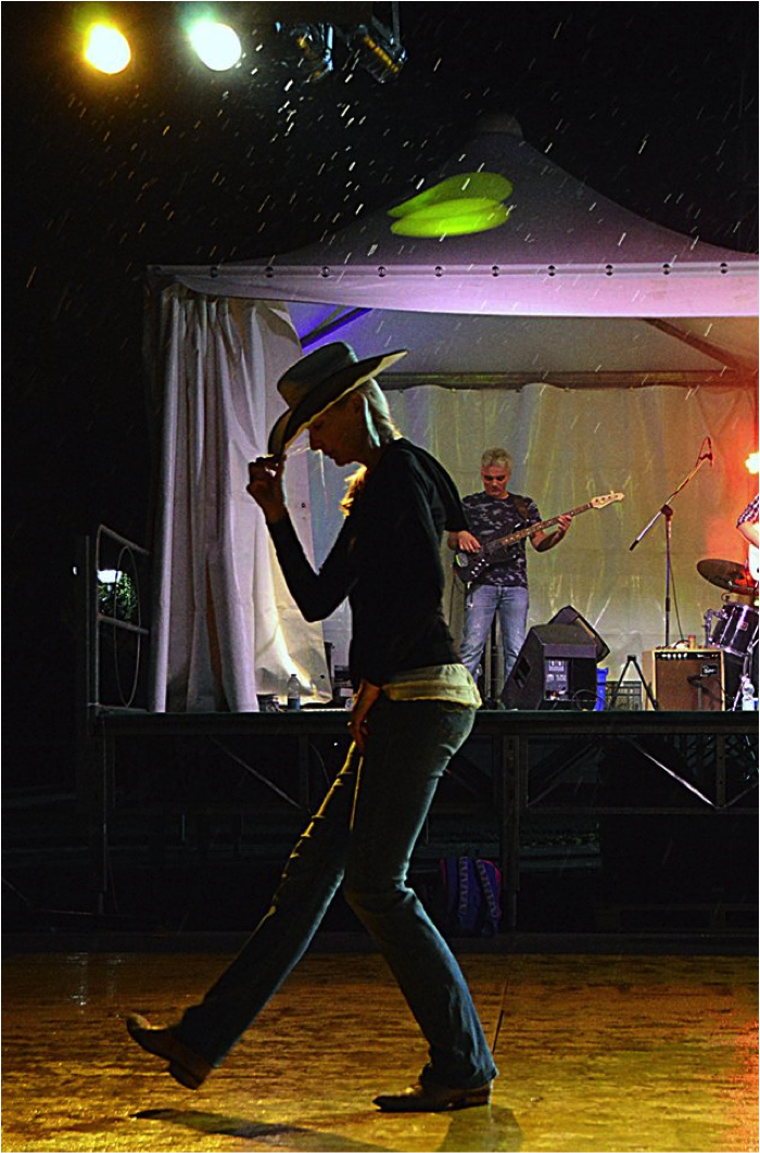 La luce delinea graficamente il corpo sinuoso dell’ultima, irriducibile danzatrice che sfida il piovasco estivo e si produce, assorta in se stessa, in una delle figure più classiche del ballo in linea: una mano alla cintura, una alla falda del cappello, il protendersi della gamba che batterà a terra il tacco dello stivale, l’altro piede saldamente piantato, a calcare la pista. Icona e personificazione essa stessa dello spirito della festa. Le gocce di poggia diventano punti incandescenti e pare di sentirle sfrigolare contro i riflettori: la donna le ignora, proseguendo nel suo ballo solitario, mentre il bassista alle sue spalle, in piena luce sul piccolo palcoscenico, si concentra su un ultimo accordo.